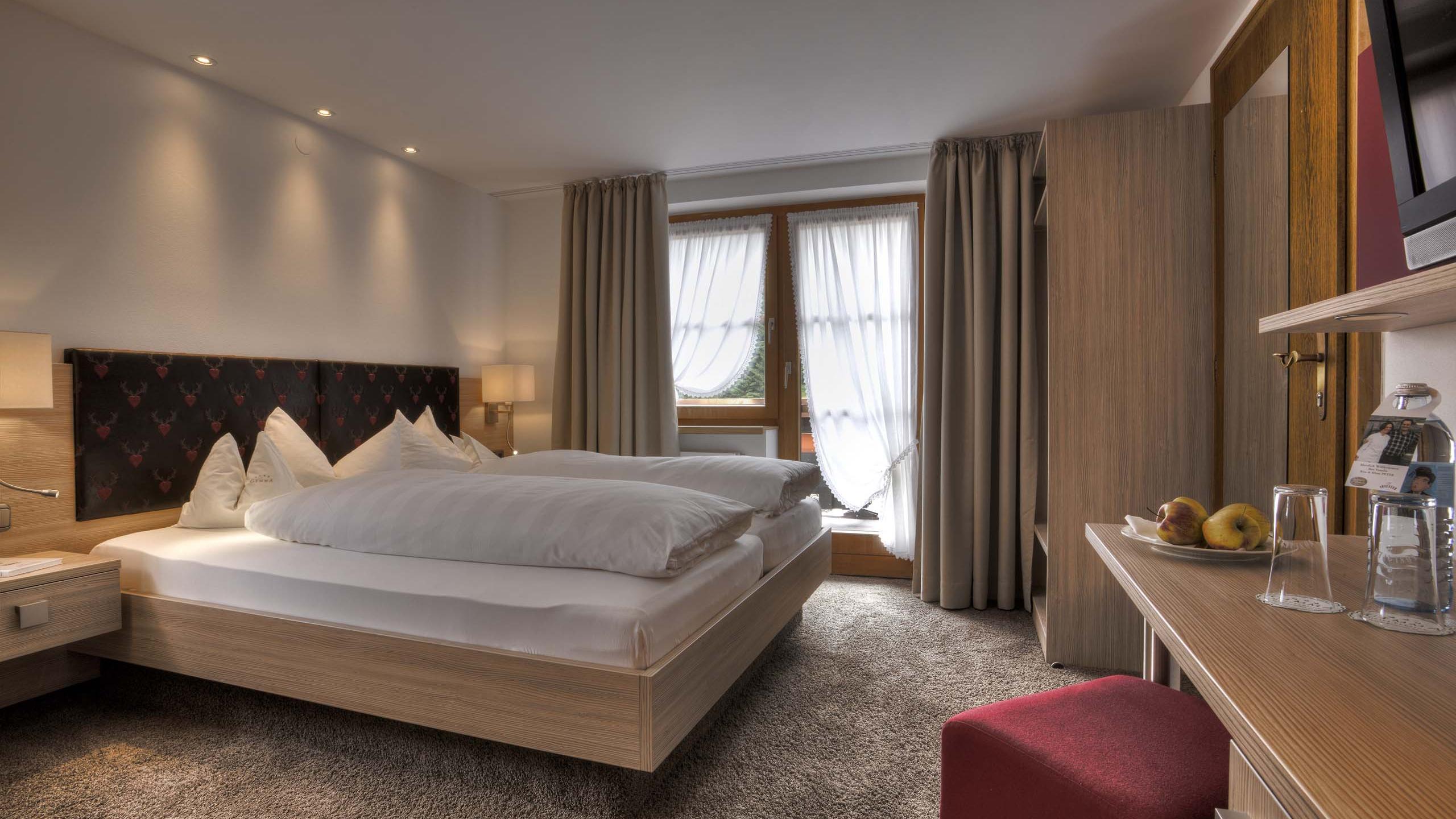 The double room is the perfect choice for those who like active holidays. The north- or west-facing balcony offers a magnificent view across the valley to Riezlern. The amenities include a bathroom with shower, toilet, illuminated cosmetic mirror, hairdryer, bathrobe, and slippers. In addition, there is underfloor heating, a radio, satellite TV, tablet with IP telephone and TV remote control, Wi-Fi, minibar, and safe. The toilet and the double bed are low to increase comfort and accessibility for all our guests.