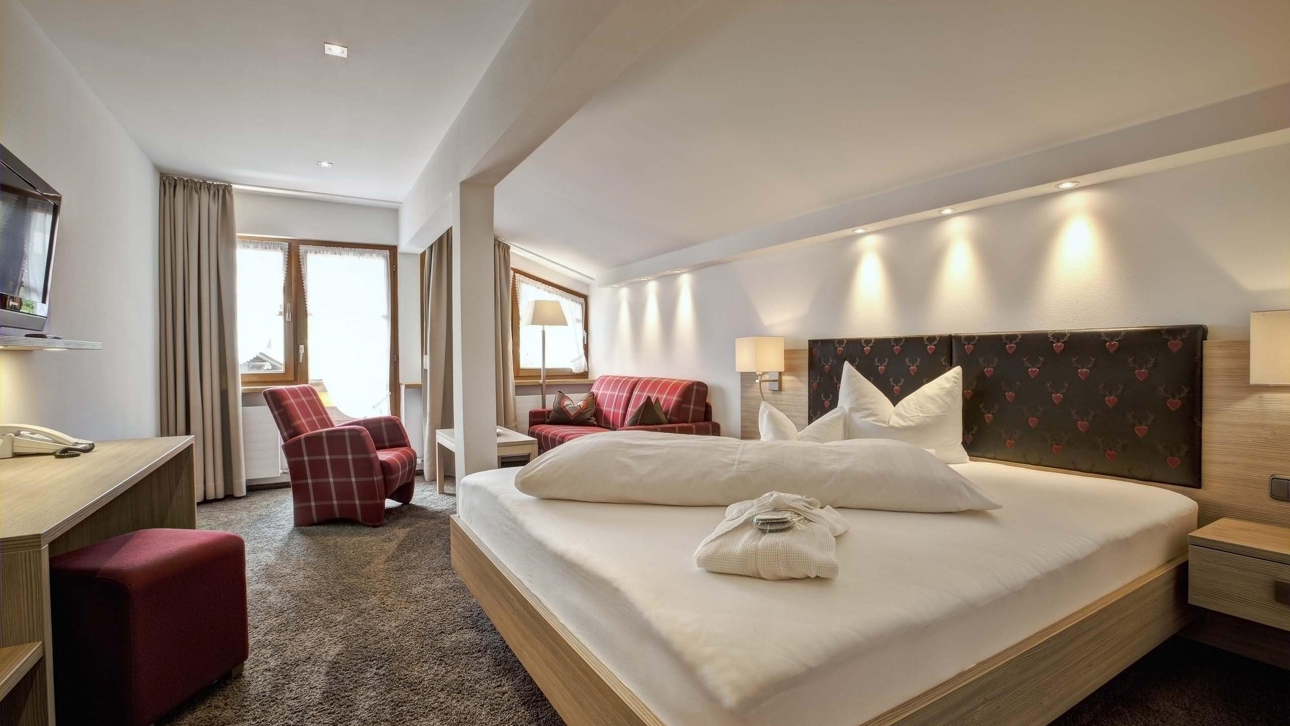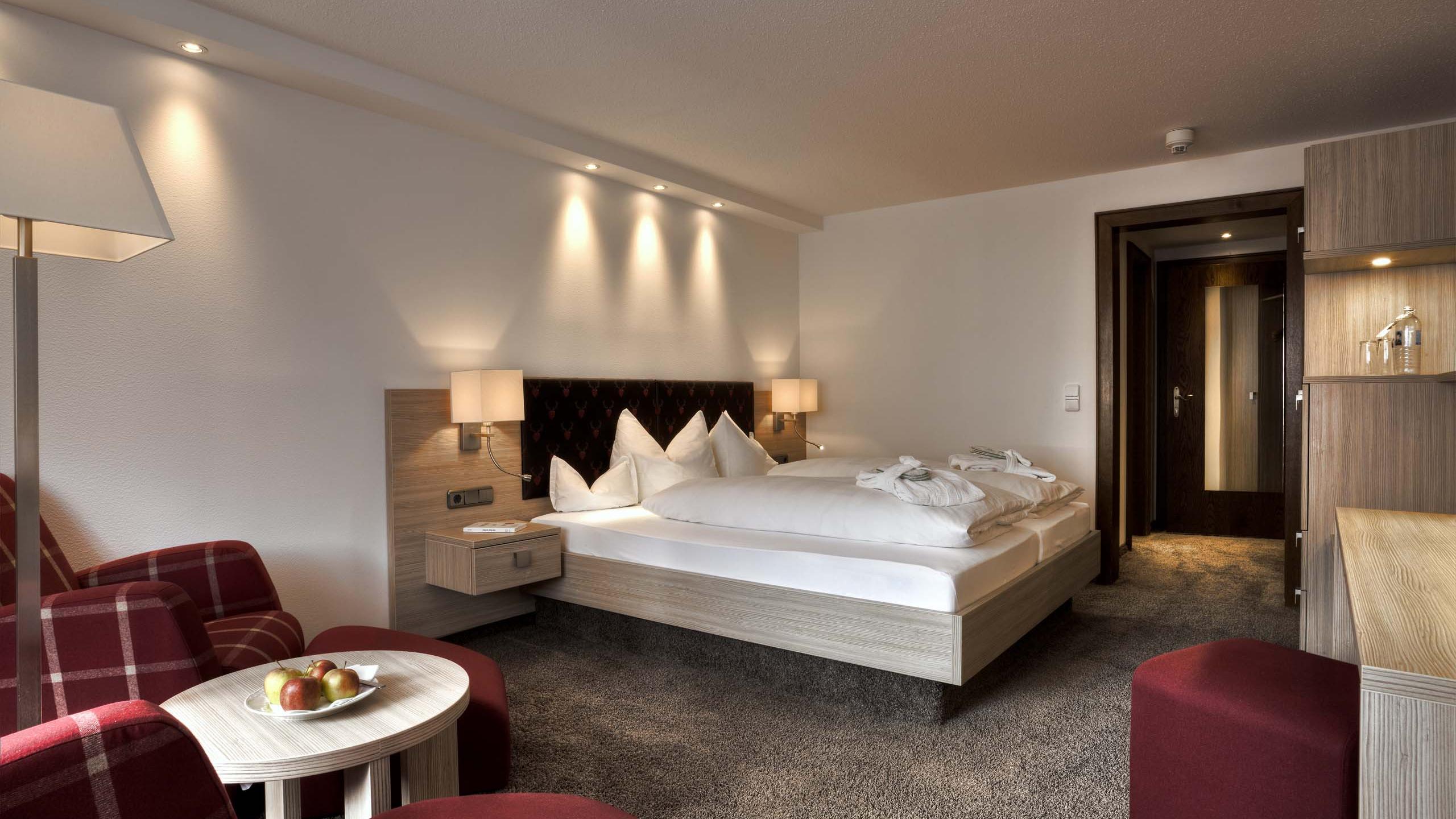 Für alle, die die Sonne lieben: Mit hellem Südwestbalkon bietet dieses Doppelzimmer alle Annehmlichkeiten für Ihren Wohlfühlurlaub. Zur Ausstattung gehören das Badezimmer mit Dusche und WC oder Badewanne und WC, beleuchtetem Kosmetikspiegel, Haartrockner, Bademantel und Badeschlappen sowie Fußbodenheizung, Radio, SAT-TV, Tablet mit IP-Telefon und TV-Fernbedienung, WLAN, Minibar und Safe. Tipp: Das WC und das Doppelbett haben „Seniorenhöhe“, was das Aufstehen erleichtert. Auf Wunsch können Sie in diesem Zimmer ein Zusatzbett nutzen.